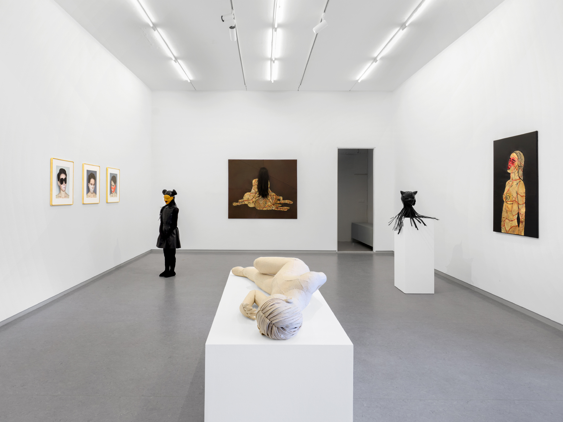 In more recent series, Grzeszykowska works with skin-like materials—pigskin and leather—stitched together to form representations of the body: masks, faces, and hybrid animal figures. These works provoke unsettling associations with a body that is wounded, flayed, or scarred. Mary Shelley famously gave no name to the creature in her novel Frankenstein, referring to it simply as “creature,” “wretch,” “being,” “daemon,” or “monster.” Similarly, Grzeszykowska’s works evoke human-made beings—akin to golems—while also referencing the erotic and fetishist connotations of masks and leather as second skin or bodily shell.